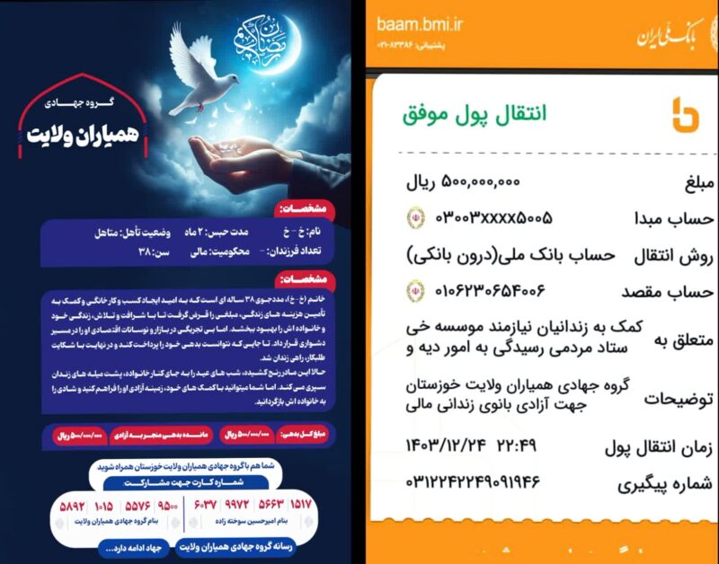 ۳.جمع آوری و پرداخت ۵۰ میلیون تومان بدهی مالی جهت آزادی بانوی زندانی مالی