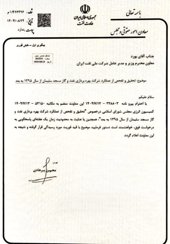کارون نیوز _ به درخواست دکتر رضا جباری، عضو هیئترئیسه مجلس شورای اسلامی، کمیسیون انرژی مجلس وارد مرحله تحقیق و تفحص از عملکرد شرکت بهرهبرداری نفت و گاز مسجدسلیمان شده است. این بررسی، عملکرد این شرکت را از سال ۱۳۹۵ به بعد مورد واکاوی قرار میدهد.